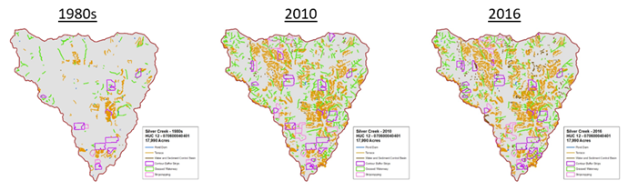 1. Landowners and farmers have constructed many of these practices since the 1980s. This can be seen by comparing the density of practices in the Silver Creek HUC in northeast Iowa. For example, the miles of terraces (shown in orange on the maps) increased by 276% between the 1980s and 2016, while the miles of WASCOBs increased by 8400% in the same time period.