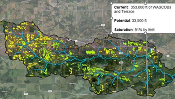2. Researchers can now look at a watershed scale to not only determine where terraces and WASCOBs are currently located but can also identify areas on the landscapes that could benefit from constructing additional terraces and WASCOBs. Below is a map of the Wolf Creek watershed in southeast Iowa showing the location and length of terraces and WASCOBs. By using  other digital technologies, it is possible to estimate the saturation of a practice and the potential to install additional terraces and WASCOBs. In this watershed, there are 353,000 feet of terraces and WASCOBs which is 91% of the possible locations suitable for these structures. This leaves only 33,500 feet of potential terraces that could still be built in the proper position in this watershed to achieve 100% coverage of terraces in the Wolf Creek watershed. This is a clear example of farmers and landowners recognizing the need to reduce soil and runoff and putting in terraces and WASCOBs to do so.