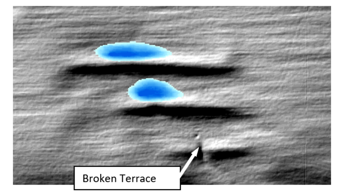 3. A third feature of the mapping project is identifying structural flaws in structures such as terraces and WASCOBs. The LiDAR image below shows a break in the third terrace that allowed upstream runoff to flow through the break potentially causing erosion and gulleys. The first and second terraces are functioning properly as indicated by pooling of water on the upstream side of the terraces. Images like this could inform landowners that a breach has occurred and allow them to repair it.