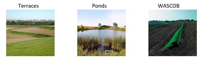 Using sensor technology, ISU assembled a baseline of practices from 2007-2010 of up to 40,000 acres of watershed level including: terraces, water and sediment control basins (WASCOB), grassed waterways, pond dams, contour strip cropping and contour buffer strips.