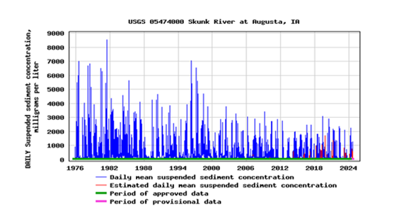 4. The installation of structural practices like ponds, terraces, WASCOBs and waterways has had a profound effect on reducing sediments in Iowa’s water bodies. Not only do they slow down runoff from heavy rain events, they also reduce soil erosion and trap sediments in the field instead of having sediment leaving the field and enter creeks, streams rivers and drainage ditches. One example is the sediment loading results from 1976 through 2024 in the Skunk River recording station near Augusta in southeast Iowa. The blue line on the graph below is the suspended sediment concentrations during the nearly 50 years of monitoring at Augusta. Despite the variability of year-to-year rainfall, there is a trend of lesser amounts of sediments in the Skunk River in the last 15-20 years compared to the levels in the 1970s through 2000. The lower levels of sediments in recent years are likely due to structure practices but also less tillage and use of cover crops by farmers in the watershed.