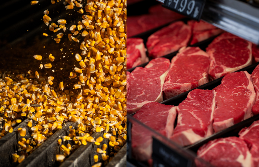 From corn to steak. Perfectly marbled, juicy steaks. You can thank corn for that. All cattle start on a diet of grass, but “corn-fed beef” means the animals transition to a grain-based diet, which increases the fat-to-muscle ratio, creating a more flavorful, juicier steak.